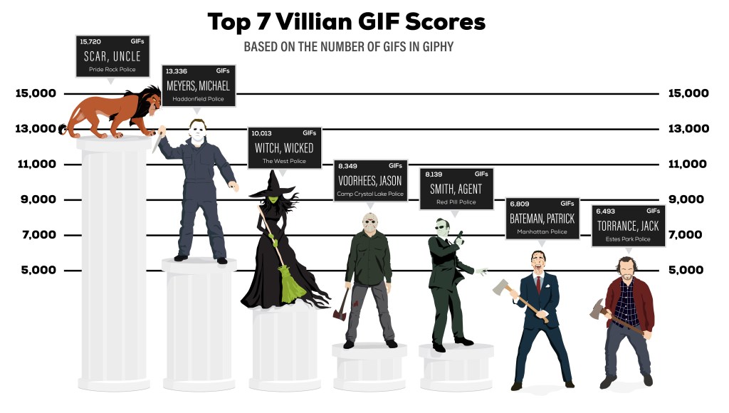 Yep. With 14% of all used villain GIFs, The Lion King’s Scar reigns supreme. I mean, I suppose the sourpuss third-in-line to the throne would be giddy to finally be on top for once-legitimately.