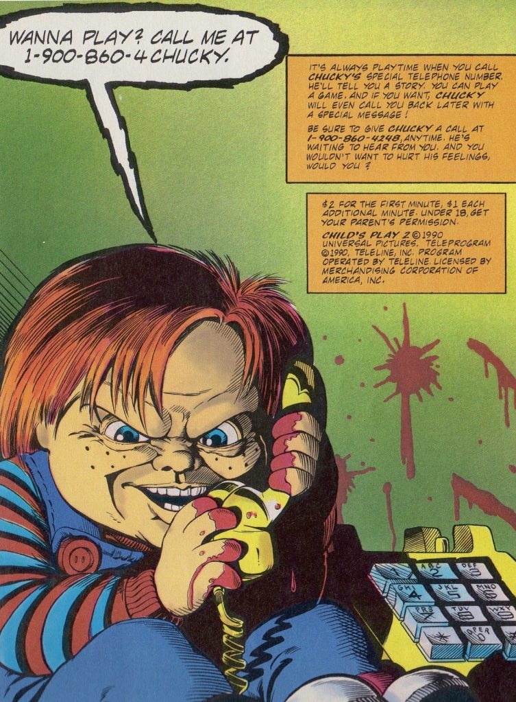 How many were aware that The Lakeshore Strangler turned into a plastic nightmare in red sneakers and had his very own hotline? I never personally called this one, and it wasn’t advertised on television, at least to my own knowledge. Instead, the ads for the horror hotline popped up in the Child’s Play 2 comic book series that was put out by Innovation Comics. Apparently, if you called the number, Chucky would tell you a story and play a game with you. The message also gave you an option for Chucky to call you back later with a special message and extra charges added to the parental unit’s phone bill! What a sneaky, yet stunning scam this was for young fans of the killer doll.