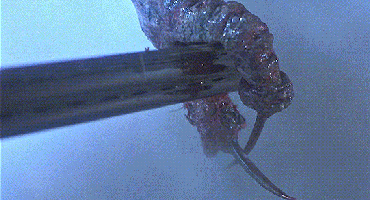 The biggest kick in the dick is at the very end, however. Brundle, insane with an idea to fuse him, and a now pregnant Veronica together in the telepods seem like the answer to his problem. With the help of a concerned, although douche ex-lover and co-worker of Ronnie’s, she manages to escape leaving Brundle’s DNA to be accidentally fused with the pod itself. Now we have a mutated human-fly-telepod. Good grief. Seth, reaching deep inside to his human counterpart shakily grabs a shotgun a distressed Veronica has in her hand and points it at his head, urging his love to end the madness. A hysterical Geena Davis complies and blows Goldblum’s brains out, giving us one of the most miserable endings to any horror film.