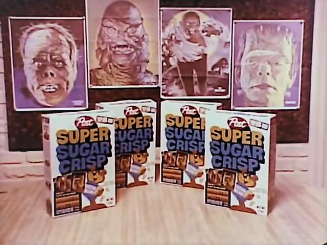 Before Golden Crisp, Super Sugar Crisp was the domain name for the Post sugary crispy cereal fronted by a sleepy-looking bear mascot; and in the 70s’ Universal Monsters dominated this cereal’s campaign- possibly in competition with General Mills’ Monster Cereals. In 1976, the Universal Monster glow-in-the-dark finger puppet heads that included Frankenstein, The Mummy, The Wolfman, and The Phantom of the Opera were fantastic treasures to find among a box of pediatric diabetes.