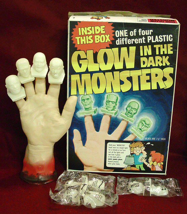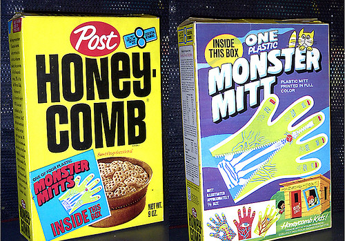 Back in the early ‘70s, Post Honeycomb cereal packaged these fabulous cheap plastic gloves marketed as Monster Mitts. Four different and colorful designs were placed at random inside select boxes consisting of a ghoulish hand unzipping to expose a skeleton, a bloody veiny mitt with the inclusion of a spider, a sea-monster type mitt, and a blue veiny mitt with an all-seeing eyeball. SWEET.