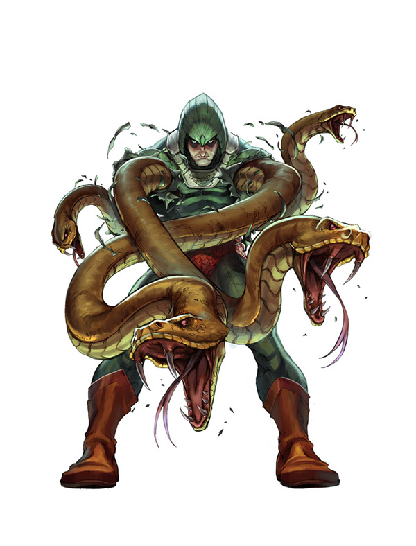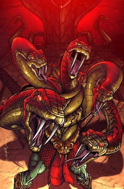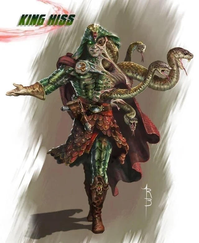 When King Hiss reveals his true nature the human skin is shed and a lashing body of hissing snakes is exposed underneath. He’s a hissing coil of many vipers, each one sharing the same mind. He is a demon among men, a serpent hiding behind a garden of flesh. It’s so classic and apocalyptic.
