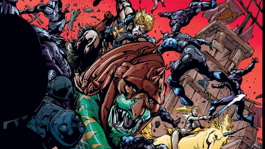Old enemies must now lay aside past grievances and prepare to face the rising shadow that spells uncanny doom across the horizon. It’s from here on that things happen at a break-neck pace. On one page, we see the conclusion of our generation’s epic saga between heroes and villains – He-Man and Skeletor are joined together now and fighting on the same side – as brave warriors ready their hearts for the approaching storm, and on the other page is a blood-stained battlefield bursting with brave souls struggling for the future of their home world.