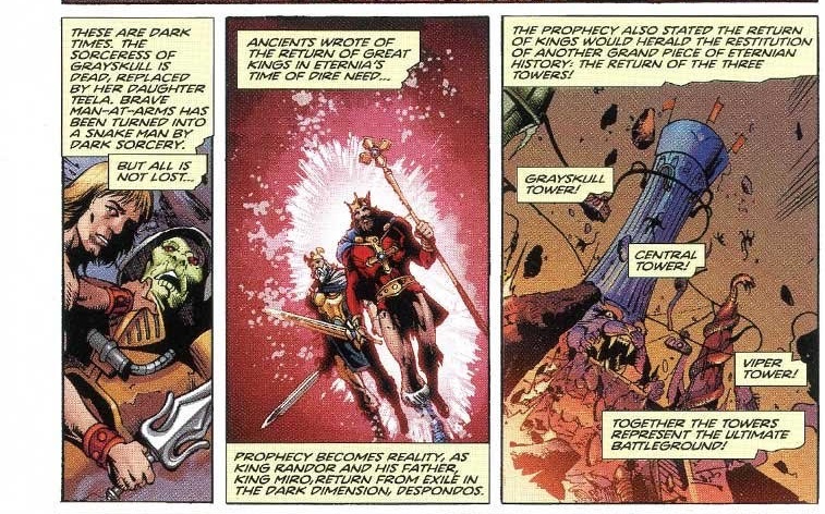 King Grayskull wins a victory by maiming Hordak while Eldor casts a spell that hides the three central towers of Preternia deep within the heart of the planet where the forces of evil cannot molest them.