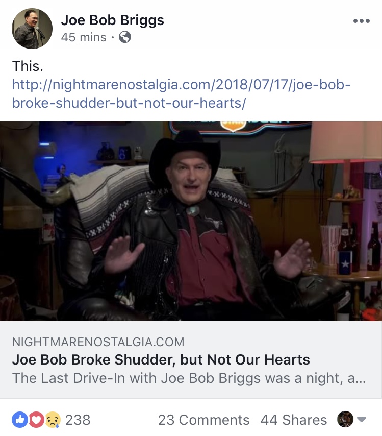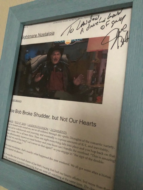 I interviewed Joe Bob, my lifelong hero because of her website. In fact, his rep shared what I’d written following his original (believed at the time to be his farewell) Shudder marathon on Facebook with a single word, “This.”