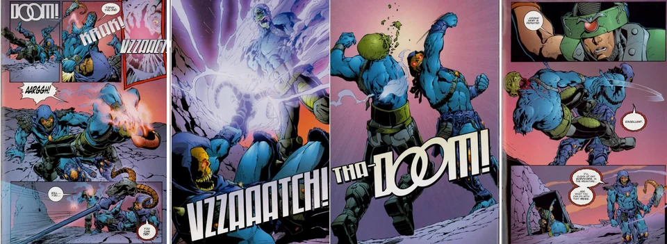 Side Note: One moment that happens later but one I love is the ‘creation’ of Trap Jaw. You see in the comic panel above he isn’t yet the iconic villain we know him as. Early on he’s known as Kronis. The guy is also Gar but a mean son of a bitch too. He stupidly will someday challenge Skeletor to which Skeletor uses magic to utterly destroy the man’s head and rips his lower jaw right off his face. That’s fucking savage.