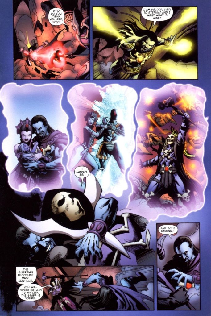 It was at that moment when Keldor touched him, a vision transpired before the ancient one’s mind. A vision of the future presented itself, a future involving this young sorcerer and the Faceless One’s daughter, Evil Lynn. How their destiny was intertwined and how someday they would give birth to a son, the Faceless One’s grandchild who would then hold the Havoc Staff.