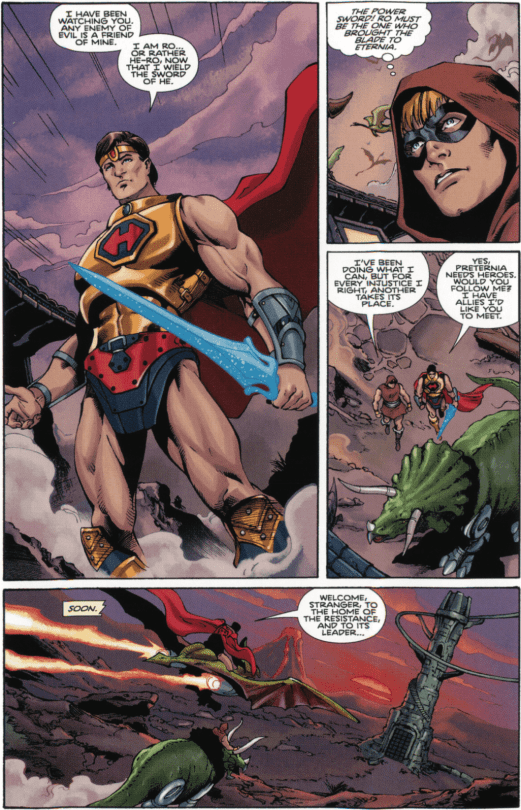 So He-Man rushes in to protect the innocent once again, that’s three times now, and at last, He-Ro reveals himself and helps with defeating the brutes. He-Ro, who’s been working in secret with He-Man all along, upon greeting him quickly invites him to meet with the Masters of the Universe of Preternia. Having proved his valor he’s also extended the invitation to join their league as they fight to break down the strongholds of Evil mounted against them.