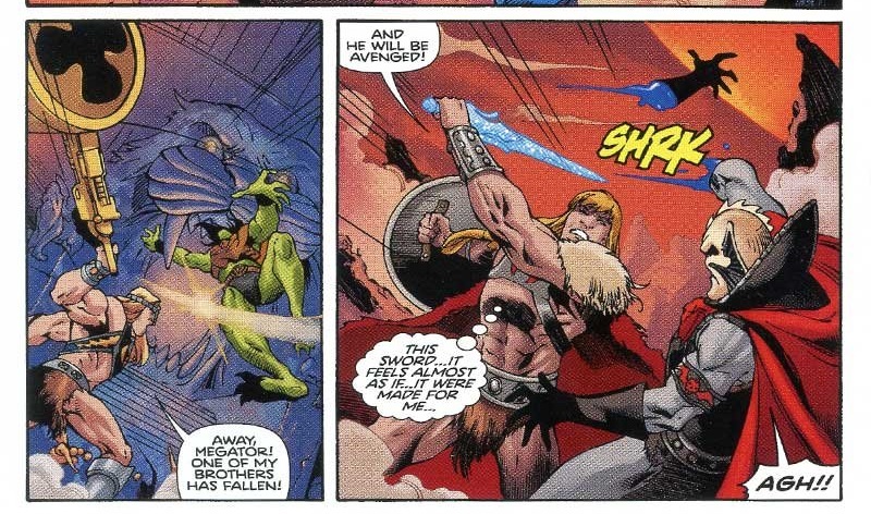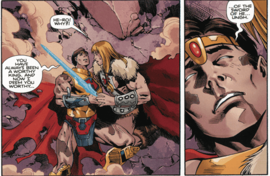 It’s here that He-Ro, with his last breaths, passes the cosmic sword to the king and a line of He-empowered heroes begins in the dynasty of Eternia. A legacy of legends is born this hour.