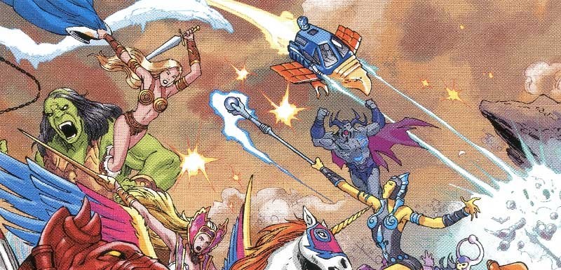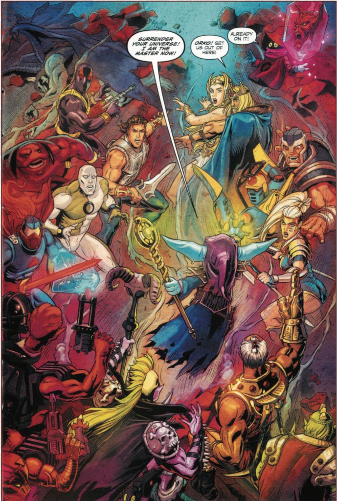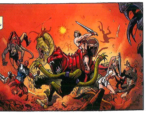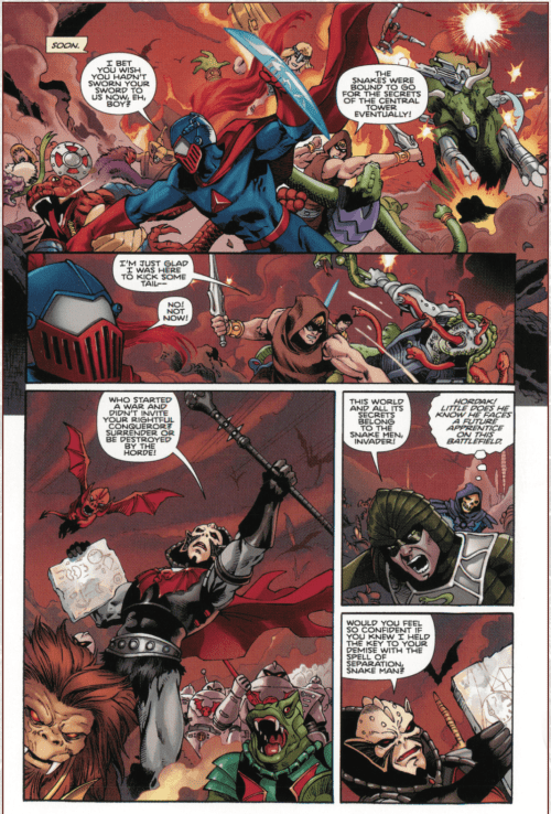 Old enemies must now lay aside past grievances and prepare to face the rising shadow that spells uncanny doom across the horizon. It’s from here on that things happen at a break-neck pace. On one page, we see the conclusion of our generation’s epic saga between heroes and villains – He-Man and Skeletor are joined together now and fighting on the same side – as brave warriors ready their hearts for the approaching storm, and on the other page is a blood-stained battlefield bursting with brave souls struggling for the future of their home world.