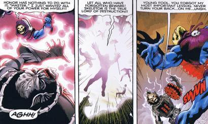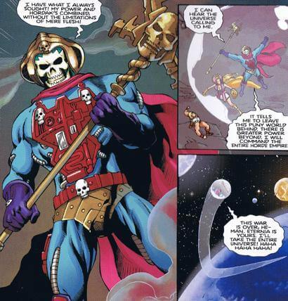 As the two legends meet in a furious battle of screeching swordplay Skeletor jabs He-Man and gloats over He-Ro’s death. Not even the Masters’ friend, the mightiest wizard in the universe, could outmatch the forces of evil. Just as the night overtakes the day light evil will eclipse the righteous. Skeletor will rule sovereign in all timelines!