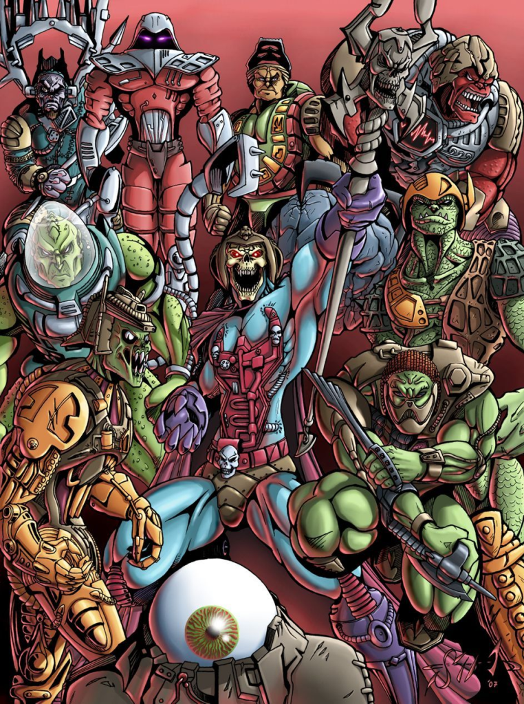 Forces from all sides are joined together in a desperate war for destiny’s sake. On one side you have the union of the Masters and Skeletor together, and if you look closely you’ll see a small cameo of Saurod from the He-Man movie. I just saw him now while preparing this article. I heard Blade is in here somewhere too but I’ve yet to spot him. You also have Skeletor, robbed of his Havoc Staff, holding a demonic BFG and blasting plasma beams upon people who once served him.