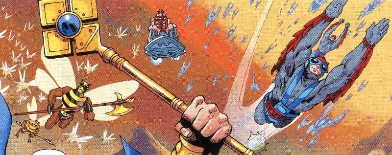 Meanwhile, Stratos flies in overhead leading areal troops of his own kind alongside Buzzoff and his warrior bees. Armies fill the sky like storm clouds while a maelstrom cracks across the land below. The fight multiplies on all sides and the four corners of Eternia shake by the conflict.