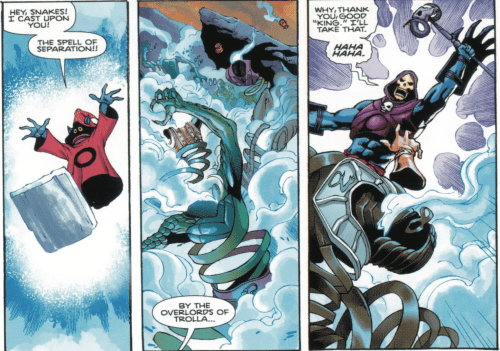Not a moment too soon I might add, for unbeknownst to the primary evils, this has all been a distraction to allow Orko time enough to cast the Spell of Separation. Perhaps for the first time in his life, the little Trollan manages to make a spell work and its galactic effects are terrifying. In the twinkling of an eye, the spell cracks against the fabric of reality, and in that blinding instant every living Snake Man from their mightiest god to their king and all the way down to their lowliest slave is eradicated from existence.