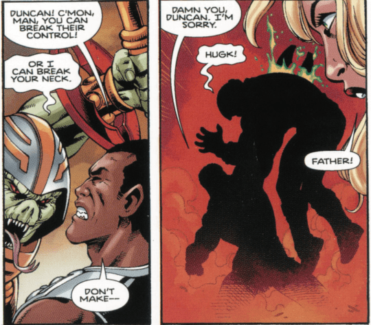 Nevertheless, no longer can Evil muddle the once noble soldier’s mind. He is also granted the gift of a warrior’s death. Teela sees him fall by the lethal blow and rushes over to the man she once called father and cradles him in her arms. As a final act of grace Duncan, in his fading moments, recognizes his daughter and whispers how proud both he and her mother are of her. Then he dies in peace as the man he once was.