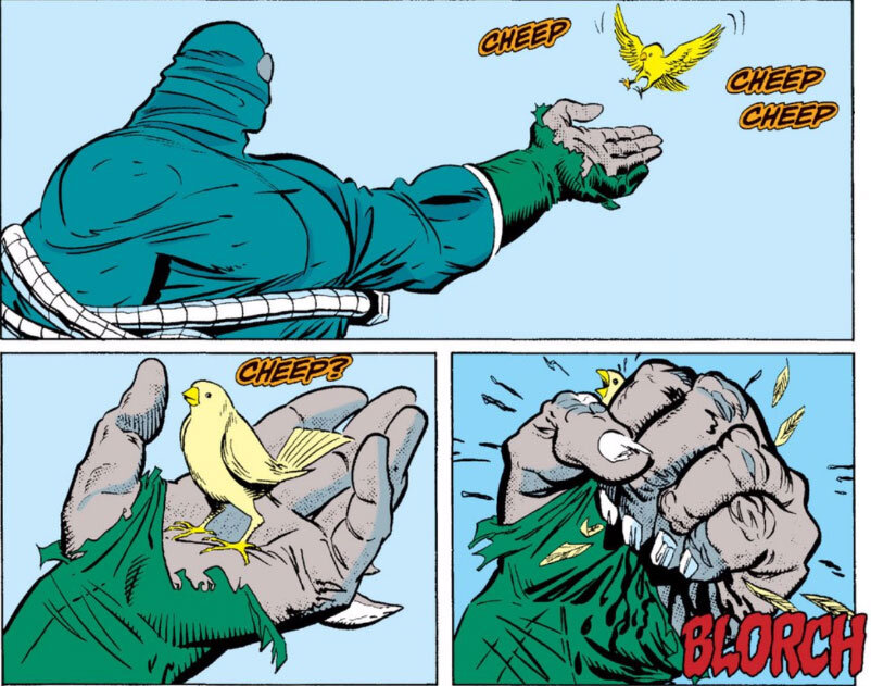 The very first thing he does once he’s freed is crush a little sweet birdie who made the mistake of landing in the monster’s open hand.