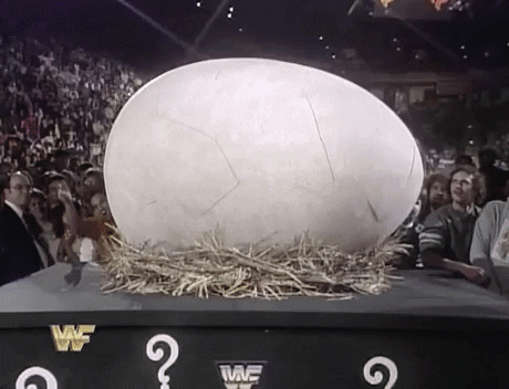 Well, anyways the WWF promoted this “Big Surprise” they had in store for us that would be revealed at the Thanksgiving Survivor Series via promos and displaying this oversized egg at live events leading up to the big day. So of course, we were all riddled with anxiety, placing bets on what exactly was inside this damn thing.