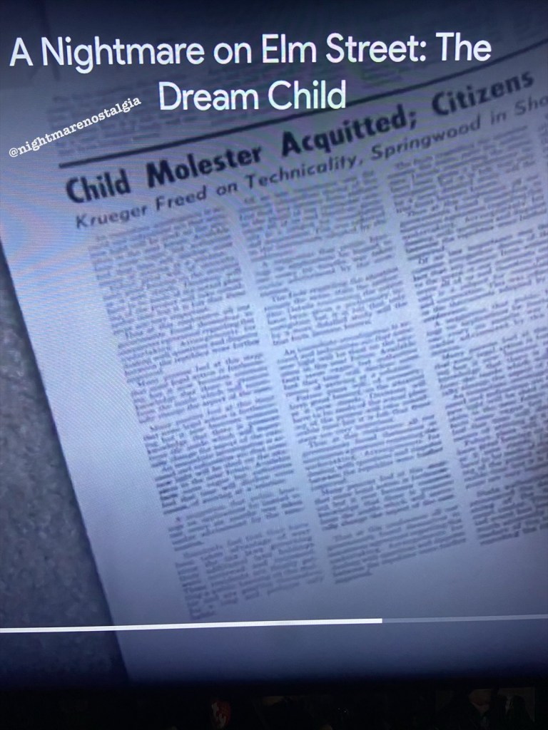 More than halfway through THE DREAM CHILD, Alice (Lisa Wilcox) and Mark (Joe Seely) are seen in Alice’s bedroom discussing how to move forward after realizing Freddy is after Alice’s unborn child. Mark brought over a bunch of old newspapers ranging from the demise of Amanda Krueger, to the trials of Freddy and behold- this screenshot from the ending of that scene: